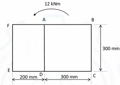 A two-cell wing box is shown in the figure. The cell walls are 1.5 mm thick and the shear modulus G = 27 GPa. If the structure is subjected to a torque of 12 kNm, then the wall AD will experience a shear stress of magnitude _______ MPa. (round off to one decimal place)