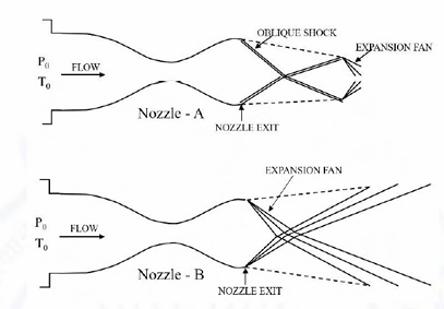 The figure shows schematics of wave patterns at the exit of nozzles A and B operating at different pressure ratios.