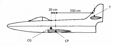 An airplane weighing 5500 kg is in a steady level flight with a speed of 225 m/s. The pilot initiates a steady pull-up maneuver with a radius of curvature of 775 m. The location of the center of gravity (CG), center of pressure on the wing (CP), and point of action (T) of tail force are marked in the figure. Use g = 9.81 m/s2. Neglect drag on the tail and assume that tail force is vertical. Assuming the engine thrust and drag to be equal, opposite and collinear, the tail force is _______ kN. (round off to one decimal place)