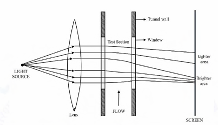 The figure shows a schematic of a set-up for visualization of the non-uniform density field in the test section of a supersonic wind tunnel. This technique of visualization of high-speed flows is known as: _______.