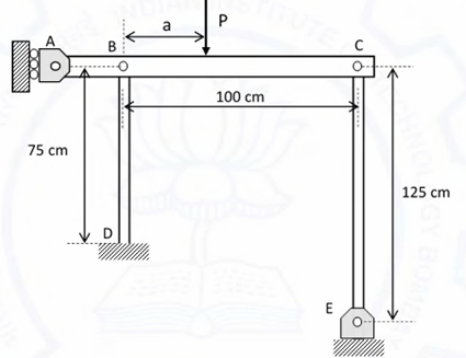 A rigid horizontal bar ABC, with roller support at A, is pinned to the columns BD and CE at points B and C, respectively, as shown in the figure. The other end of the column BD is fixed at D, whereas the column CE is pinned at E. A vertical load P is applied on the bar at a distance 'a' from point B.