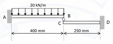 Two cantilever beams AB and DC are in contact with each other at their free ends through a roller as shown in the figure. Both beams have a square cross-section of 50 mm x 50 mm, and the elastic modulus E = 70 GPa. If beam AB is subjected to a uniformly distributed load of 20 kN/m, then the compressive force experienced by the roller is _______ kN. (round off to one decimal place)