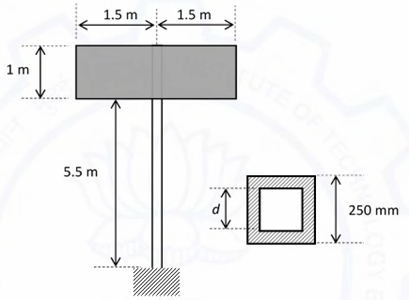 A 3 m x 1 m signboard is supported by a vertical hollow pole that is fixed to the ground. The pole has a square cross-section with outer dimension 250 mm. The yield strength of the pole material is 240 MPa. To sustain a wind pressure of 7.5 kPa, the dimension d of the pole is _______ mm (round off to the nearest integer). (Neglect the effect of transverse shear and load due to wind pressure acting on the pole)