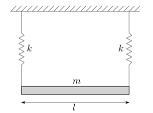 A uniform rigid prismatic bar of total mass m is suspended from a ceiling by two identical springs as shown in the figure.