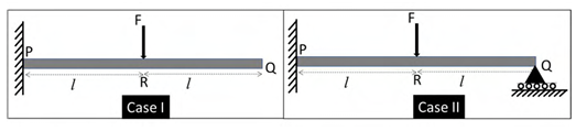 Given: The tip deflection and tip slope for a tip loaded cantilever of length L are: NL3/(3EI) and NL2/(2EI), respectively, where N is the tip force and EI is the flexural rigidity. A cantilever PQ of rectangular cross-section is subjected to transverse load, F, at its mid-point. Two cases are considered as shown in the figure. In Case I, the end Q is free and in Case II, Q is simply supported. The ratio of the magnitude of the maximum bending stress at P in Case I to that in Case II is _______. (rounded off to one decimal place)