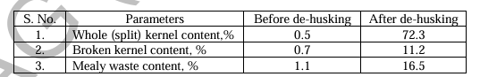 The observations recorded in a pulse de-husking operation are: S. No. Parameters Before de-husking After de-husking 1. Whole (split) kernel content,% 0.5 72.3 2. Broken kernel content, % 0.7 11.2 3. Mealy waste content, % 1.1 16.5 For this operation the effectiveness of wholeness (in decimal) of kernels will be ________.