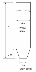 A circular grain silo with conical bottom, as shown in figure, is filled with wheat (true density 1200 kg m-3) with porosity of 0.6. Five hundred metric tonne of wheat fills 80% of its capacity (by volume). The total height (h) of the silo from its grain outlet end in m is