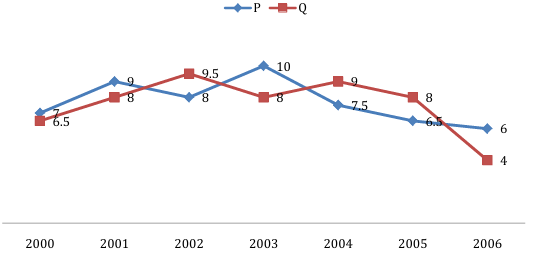Two finance companies, P and Q, declared fixed annual rates of interest on the amounts invested with them. The rates of interest offered by these companies may differ from year to year. Year-wise annual rates of interest offered by these companies are shown by the line graph provided below.