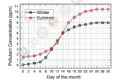 In the graph below, the concentration of a particular pollutant in a lake is plotted over alternate days of a month in winter (average temperature 10°C) and a month in summer (average temperature 30°C). Consider the following statements based on the data shown above: