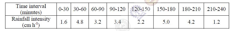 A watershed of 4.8 km² generates 4.3 cm runoff from a rain storm of 4-hour duration. The measured rainfall intensities for this storm in successive 30-minute durations are given below: