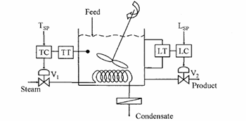 The following diagram shows a CSTR with two control loops. A liquid phase, endothermic reaction is taking place in the CSTR, and the system is initially at steady state. Assume that the changes in physical properties of the system are negligible.