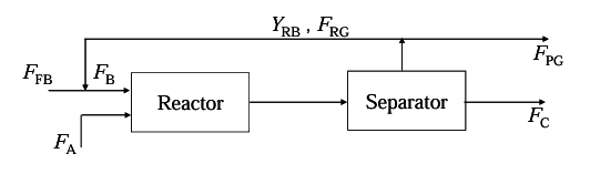 The reaction A(liq)+B(gas)→C(liq)+D(gas) is carried out in a reactor followed by a separator as shown below
