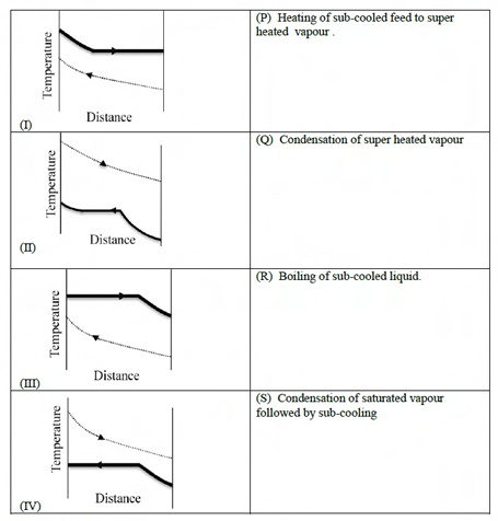 In the figure below, the temperature profiles of cold and hot fluids in counter current double pipe heat exchangers (in different modes of operation) are shown on the left. For each case, match the heat exchange process for the fluid represented by the bold curve with the options given on the right.