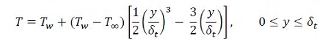 A fluid flows over a heated horizontal plate maintained at temperature Tw. The bulk temperature of the fluid is T∞. The temperature profile in the thermal boundary layer is given by: