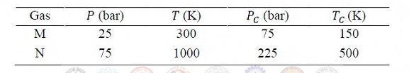 The volumetric properties of two gases M and N are described by the generalized compressibility chart which expresses the compressibility factor (Z) as a function of reduced pressure and reduced temperature only. The operating pressure (P) and temperature (T) of two gases M and N along with their critical properties (Pc, Tc) are given in the table below.