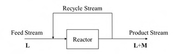 A feed stream containing pure species L flows into a reactor, where L is partly converted to M as shown in the figure.