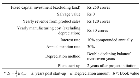 Information for a proposed greenfield project is provided in the table. The discounted cash flow