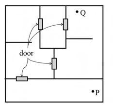 A building has several rooms and doors as shown in the top view of the building given below. The doors are closed initially. What is the minimum number of doors that need to be opened in order to go from the point P to the point Q?