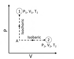 N moles of an ideal gas undergo a two-step process as shown in the figure. Let P, V, and T denote the pressure, volume, and temperature of the gas, respectively. The gas, initially at state-1 (P1, V1, T1), undergoes an isochoric (constant volume) process to reach state-A, and then undergoes an isobaric (constant pressure) expansion to reach state-2 (P2, V2, T2). For an ideal gas, CP β CV = NR, where CP and CV are the heat capacities at constant pressure and constant volume, respectively, and assumed to be temperature independent. The heat gained by the gas in the two-step process is given by