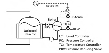 A control system on the jacket side of a reactor is shown in the figure. Pressurized water flows through the jacket to cool the reactor. The heated water flashes in the boiler. The exothermic reaction heat thus generates steam. Fresh boiler feed water (BFW) is added to make-up for the loss of water as steam. Assume that all control valves are air-to-open. The controller action, βdirectβ or βreverseβ, is defined with respect to the controller. Select the option that correctly specifies the action of the controllers.