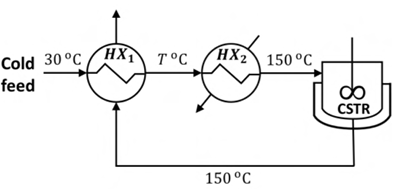 An isothermal jacketed continuous stirred tank reactor (CSTR) operating at 150 °C is shown in the figure below. The cold feed entering the system at 30 °C is preheated to a temperature T (T < 150 °C) using a heat exchanger HX1. This preheated feed is further heated to 150 °C using the utility heater HX2. The mass flow rate and heat capacity are same for all the process streams, and the overall heat transfer coefficient is independent of temperature. Which one of the following statements is the CORRECT action to take if it is desired to increase the value of T?