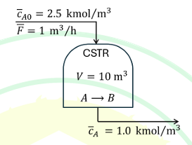 The first-order irreversible liquid phase reaction A→B occurs inside a constant volume (V) isothermal CSTR with the initial steady state conditions shown in the figure. The gain, in kmol/m3 / m3/h, of the transfer function relating the reactor effluent A concentration, cA to the inlet flow rate, F, is