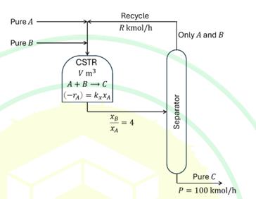 The split in the separator is perfect so that the recycle stream is free of C and the product stream is pure C. Let xi denote the mole fraction of species i (i=A,B,C) in the CSTR, which is operated in excess B with xB/xA=4. The reaction is first-order in A with the reaction rate (-rA)=kxxA, where kx=5.0 kmol/(m3h).
