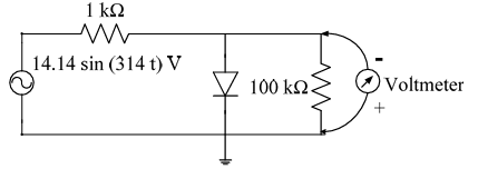 The input impedance of the permanent magnet moving coil (PMMC) voltmeter is infinite. Assuming that the diode shown in the figure below is ideal, the reading of the voltmeter in Volts is