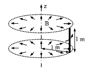 A rotating conductor of 1 m length is placed in a radially outward (about the z-axis) magnetic flux density (B) of 1 Tesla as shown in figure below. Conductor is parallel to and at 1 m distance from the z-axis. The speed of the conductor in r.p.m. required to induce a voltage of 1 V across it, should be ________.
