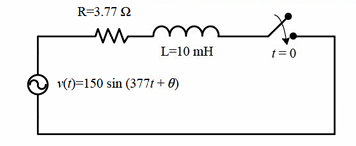 In the circuit shown below, the switch is closed at t = 0. The value of θ in degrees which will give the maximum value of DC offset of the current at the time of switching is: