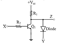 In the circuit shown below, Q1 has negligible collector-to-emitter saturation voltage and the diode drops negligible voltage across it under forward bias. If Vcc is +5 V, X and Y are digital signals with 0 V as logic 0 and Vcc as logic 1, then the Boolean expression for Z is