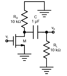 The ac schematic of an NMOS common-source stage is shown in the figure below, where part of the biasing circuits has been omitted for simplicity. For the n-channel MOSFET M, the transconductance gm = 1 mA/V, and body effect and channel length modulation effect are to be neglected. The lower cutoff frequency in Hz of the circuit is approximately at