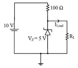 In the circuit shown below, the knee current of the ideal Zener diode is 10 mA. To maintain 5 V across RL, the minimum value of RL in Ω and the minimum power rating of the Zener diode in mW, respectively, are