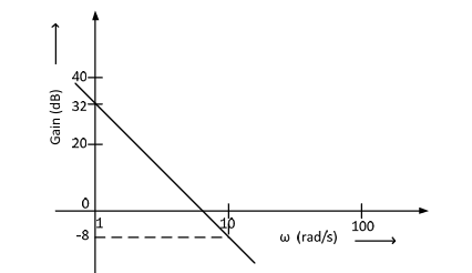 The Bode plot of a transfer function G(s) is shown in the figure below. The gain 20log|G(s)| is 32 dB and -8 dB at 1 rad/s and 10 rad/s respectively.