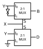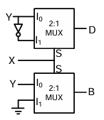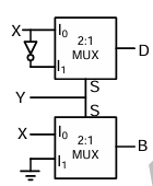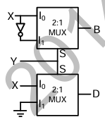 If X and Y are inputs and the Difference (D = X – Y) and the Borrow (B) are the outputs, which one of the following diagrams implements a half-subtractor?