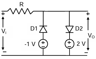 Two silicon diodes, with a forward voltage drop of 0.7 V, are used in the circuit shown in the figure. The range of input voltage Vi for which the output voltage Vo = Vi, is