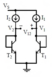 In the circuit shown, I1 = 80 mA and I2 = 4 mA. Transistors T1 and T2 are identical. Assume that the thermal voltage VT is 26 mV at 27°C. At 50°C, the value of the voltage V12 = (V1 − V2) in mV is