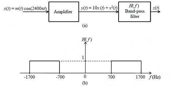 In the system shown in Figure (a), m(t) is a low-pass signal with bandwidth W Hz. The frequency response of the band-pass filter H(f) is shown in Figure (b). If it is desired that the output signal z(t) = 10m(t), the maximum value of W (in Hz) should be strictly less than