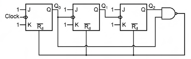 The circuit shown consists of J-K flip-flops, each with an active low asynchronous reset (Rd input). The counter corresponding to this circuit is