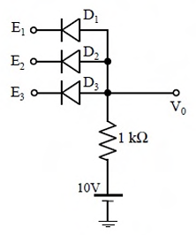 In the circuit shown, diodes D1, D2 and D3 are ideal, and the inputs E1, E2 and E3 are "0 V" for logic '0' and "10 V" for logic '1'. What logic gate does the circuit represent?