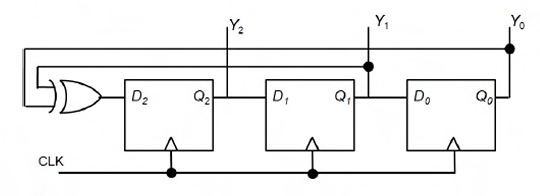 A three bit pseudo random number generator is shown. Initially the value of output Y ≡ Y2 Y1 Y0 is set to 111. The value of output Y after three clock cycles is