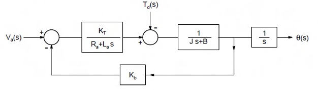 The position control of a DC servo-motor is given in the figure. The values of the parameters are KT=1 N-m/A, Ra=1Ω, La=0.1H, J=5kg-m2, B=1 N-m/(rad/sec) and Kb=1V/(rad/sec). The steady-state position response (in radians) due to unit impulse disturbance torque Td is __________.