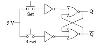 An SR latch is implemented using TTL gates as shown in the figure. The set and reset pulse inputs are provided using the push-button switches. It is observed that the circuit fails to work as desired. The SR latch can be made functional by changing
