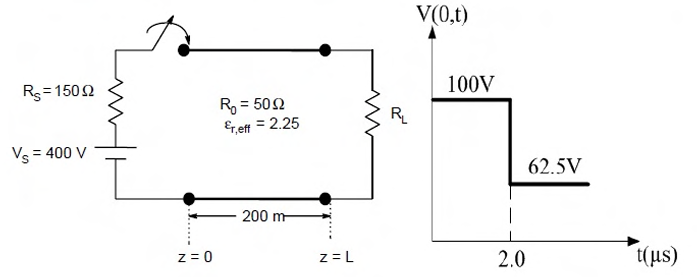 A 200 m long transmission line having parameters shown in the figure is terminated into a load RL. The line is connected to a 400 V source having source resistance RS through a switch, which is closed at t=0. The transient response of the circuit at the input of the line (z=0) is also drawn in the figure. The value of RL (in Ω) is __________.