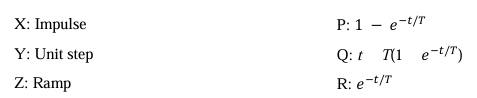 A first-order low-pass filter of time constant T is excited with different input signals (with zero initial conditions up to t=0). Match the excitation signals X, Y, Z with the corresponding time responses for t≥0:
