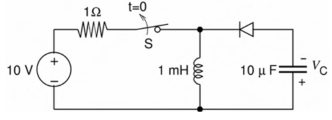 The switch S in the circuit shown has been closed for a long time. It is opened at time t=0 and remains open after that. Assume that the diode has zero reverse current and zero forward voltage drop. The steady state magnitude of the capacitor voltage VC (in volts) is