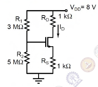 For the circuit shown, assume that the NMOS transistor is in saturation. Its threshold voltage Vtn=1 V and its transconductance parameter μnCox(W/L)=1 mA/V2.