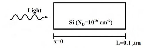 As shown, a uniformly doped Silicon (Si) bar of length L=0.1μm with a donor concentration ND=1016cm-3 is illuminated at x=0 such that electron and hole pairs are generated at the rate of GL=GL0(1-x/L), 0≤x≤L where GL0=1017cm-3s-1. Hole lifetime is 10-4 s, electronic charge q=1.6×10-19 C. hole diffusion coefficient Dp=100 cm2/s and low level injection condition prevails. Assuming a linearly decaying steady state excess hole concentration that goes to 0 at x=L the magnitude of the diffusion current density at x=L/2 in A/cm2 is