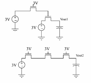 In the circuits shown, the threshold voltage of each nMOS transistor is 0.6 V. Ignoring the effect of channel length modulation and body bias, the values of Vout1 and Vout2, respectively, in volts, are