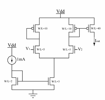 In the circuit shown, V1=0 and V2=Vdd. The other relevant parameters are mentioned in the figure. Ignoring the effect of channel length modulation and the body effect, the value of Iout is... mA (rounded off to 1 decimal place).